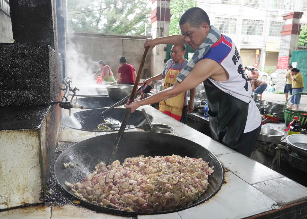 ↑6月26日,村民在忠诚镇一处后勤伙食保障点炒菜。
