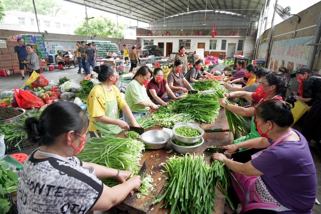 ↑6月26日,村民在忠诚镇一处后勤伙食保障点切菜。