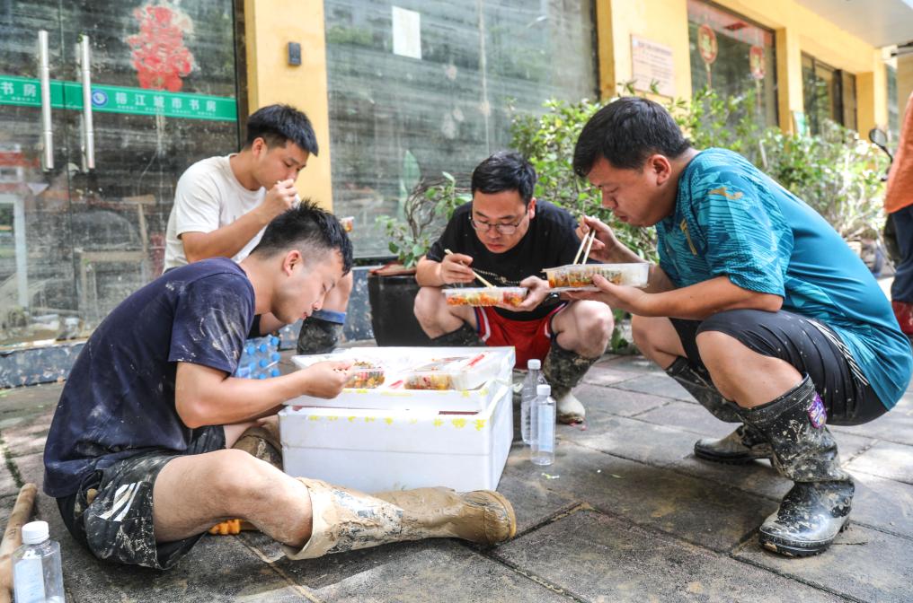 ↑6月27日,榕江县城,救援人员在救援间隙吃村民送过来的盒饭。