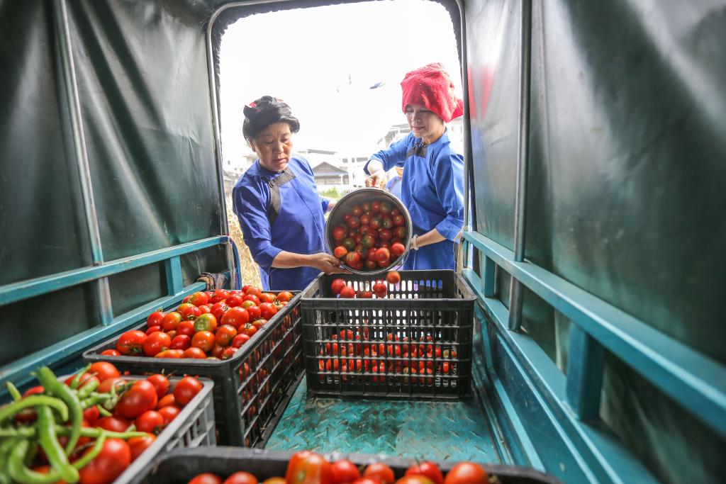 ↑6月26日,月寨村村民从自家菜园采摘西红柿后装车,准备送到忠诚镇的后勤伙食保障点。