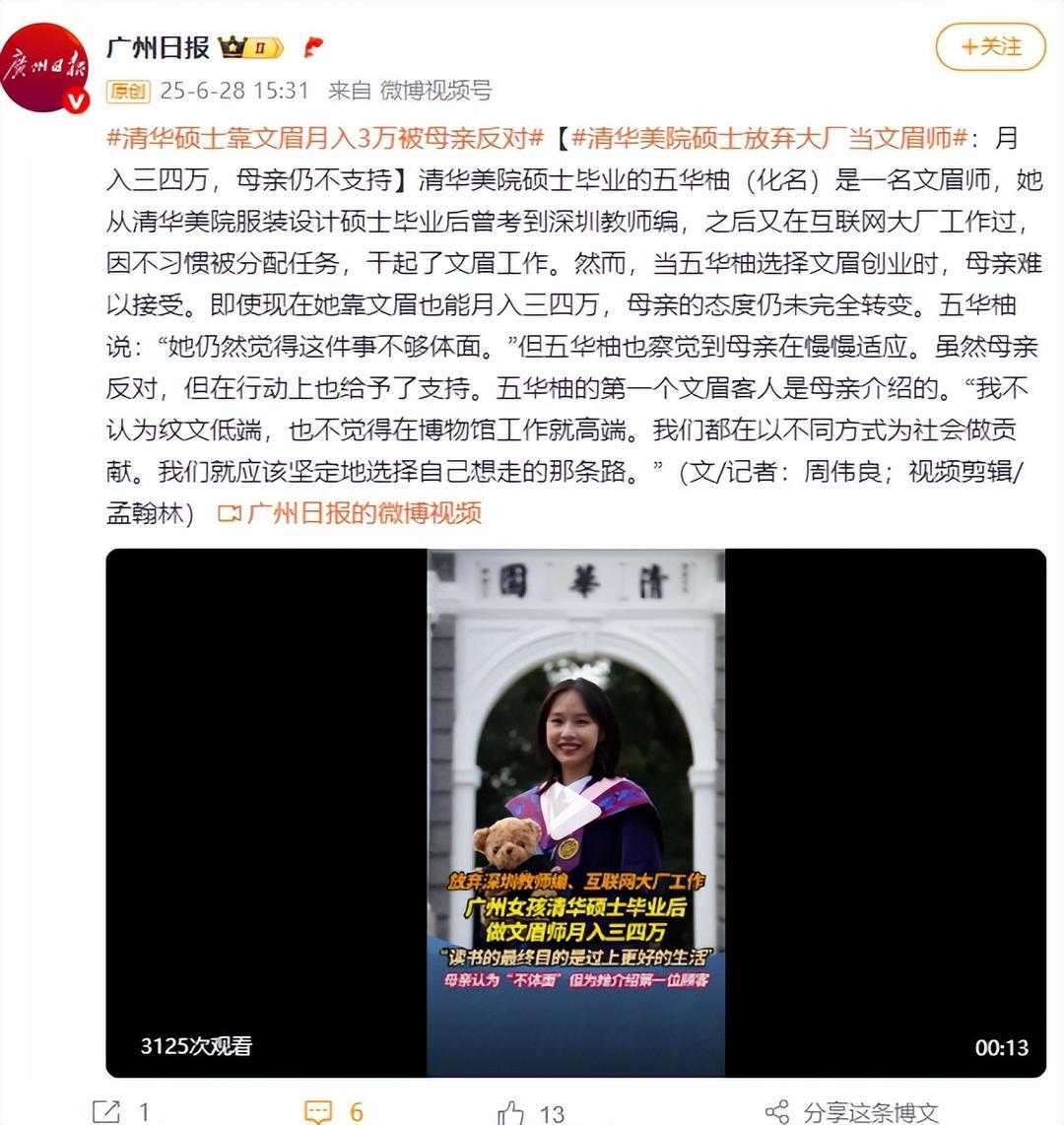清华美院硕士毕业的五华柚(化名)是一名文眉师,她从清华美院服装设计硕士毕业后曾考到深圳教师编,之后又在互联网大厂工作过,因不习惯被分配任务,干起了文眉工作。