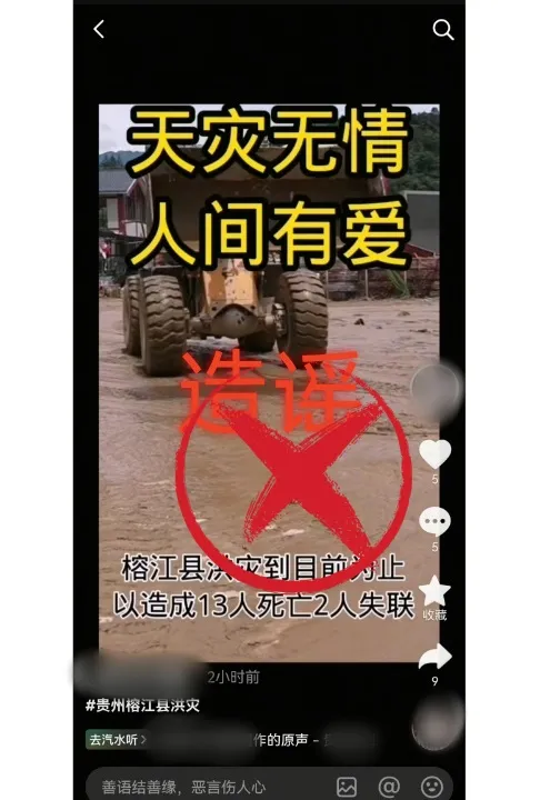 6月26日,网安部门民警在工作中发现网民朱某在某短视频平台发布榕江灾情现场视频,并配文“榕江县洪灾目前为止已造成13人死亡2人失联”。