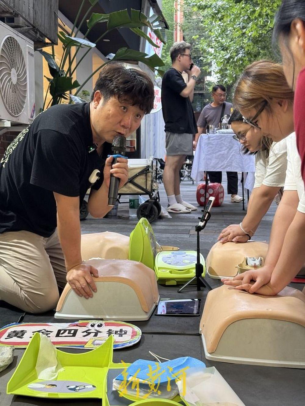 6月27日傍晚刚一下班,李春亮就急匆匆地赶来摊位,摆好教具,打开手机直播,随后向路人发出学习邀请。这是他的第96场线下教学,去年11月,李春亮将公益急救课搬上街头,每逢周末,他便出摊免费向市民普及心肺复苏和AED使用等急救知识,7个多月的时间里,他教会的学员超2000名。如今,出摊教学已经成为李春亮生活中的一部分,“这是我的兴趣所在,更重要的是急救知识关键时刻可以救命。”李春亮告诉新黄河记者,他希望未来可以一直做下去。
