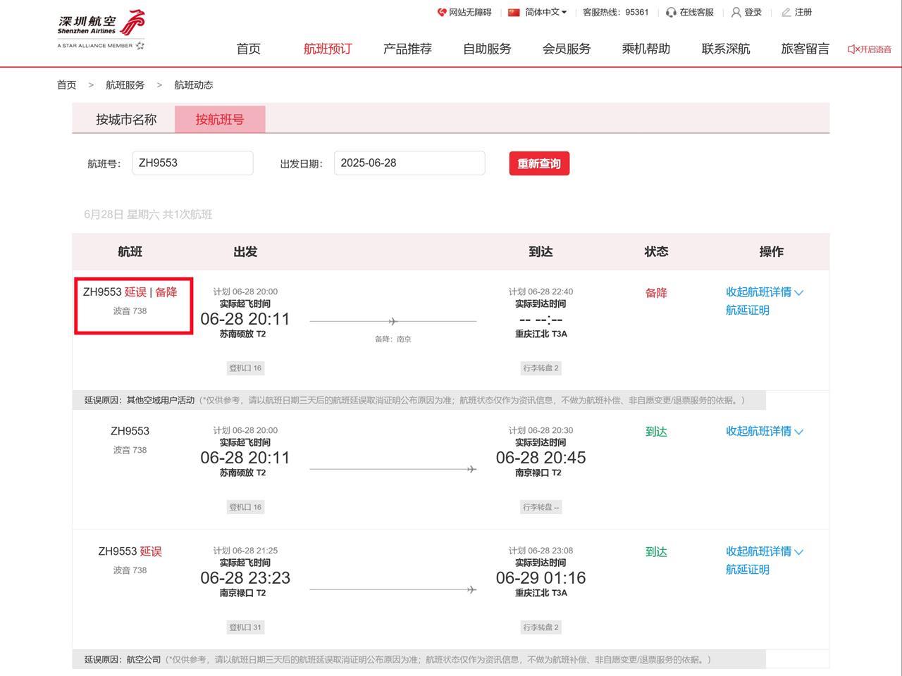深圳航空官网显示,该航班原计划6月28日晚8时从苏南硕放机场起飞,当晚10时40分抵达重庆江北机场;实际于当晚8时11分起飞,晚8时45分备降南京,晚11时23分起飞后抵达重庆。