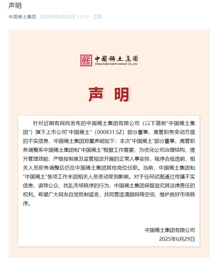 针对近期有网民发布的中国稀土集团有限公司(以下简称“中国稀土集团”)旗下上市公司“中国稀土”(000831.SZ)部分董事、高管职务变动方面的不实信息,中国稀土集团郑重声明如下:本次“中国稀土”部分董事、高管职务调整系中国稀土集团和“中国稀土”根据工作需要,为优化公司治理结构、提升管理效能,严格按制度及监管规定开展的正常人事安排,程序合规透明,相关人员职务调整后仍在中国稀土集团其他岗位任职。当前,中国稀土集团和“中国稀土”各项工作未因相关人员变动受到影响。对于任何试图通过传播不实信息、误导公众、扰乱市场秩序的行为,中国稀土集团保留追究其法律责任的权利。希望广大网友自觉抵制谣言,共同营造清朗网络空间,维护良好市场秩序。