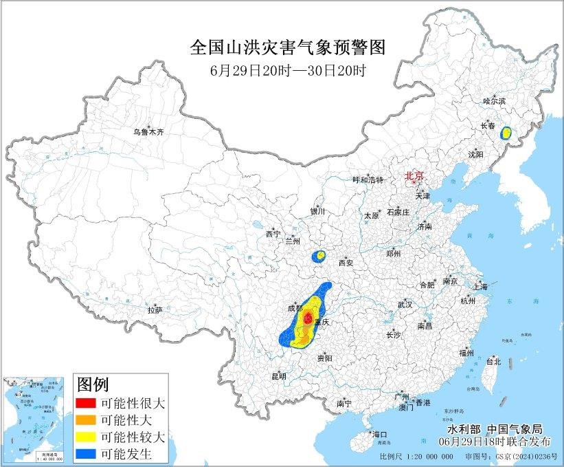 预计,6月29日20时至30日20时,四川东部、重庆西部、云南东北部等地部分地区发生山洪灾害可能性大(橙色预警),其中,四川东部、重庆西部局地发生山洪灾害可能性很大(红色预警)。其他地区也可能因局地短历时强降水引发山洪灾害,请各地注意做好实时监测、防汛预警和转移避险等防范工作。