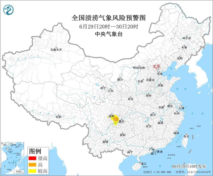 受强降雨的影响,预计6月29日20时至30日20时,四川中部和东南部、重庆西部等地部分地区发生渍涝的气象风险较高,其中,四川东南部、重庆西部等地局部地区发生渍涝的气象风险高,易形成城市内涝和农田渍害,需加强防范。