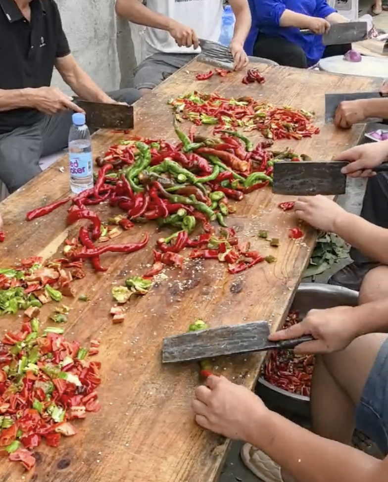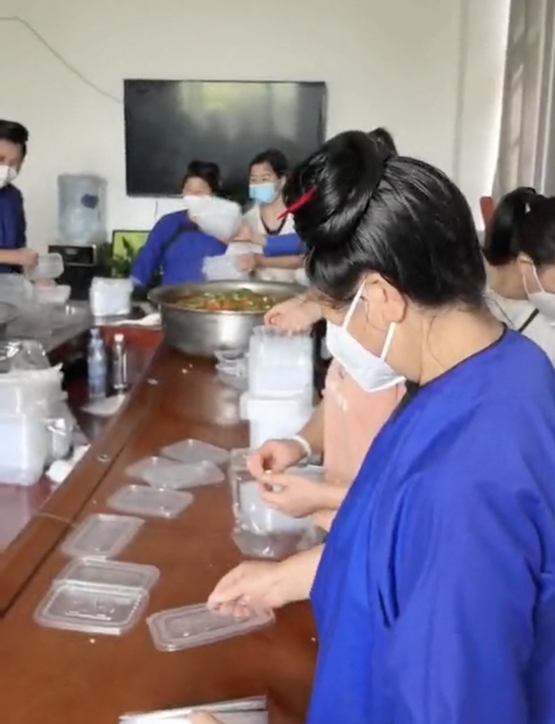 从25日,村民们每天凌晨3点开始准备饭菜,一直忙到晚上11点,前天开始他们还要支援其他队伍的后勤。村民们每天的任务是做1000份盒饭,今天村民们做了接近1400份,上午送出去了690份,下午可以送出去700多份。