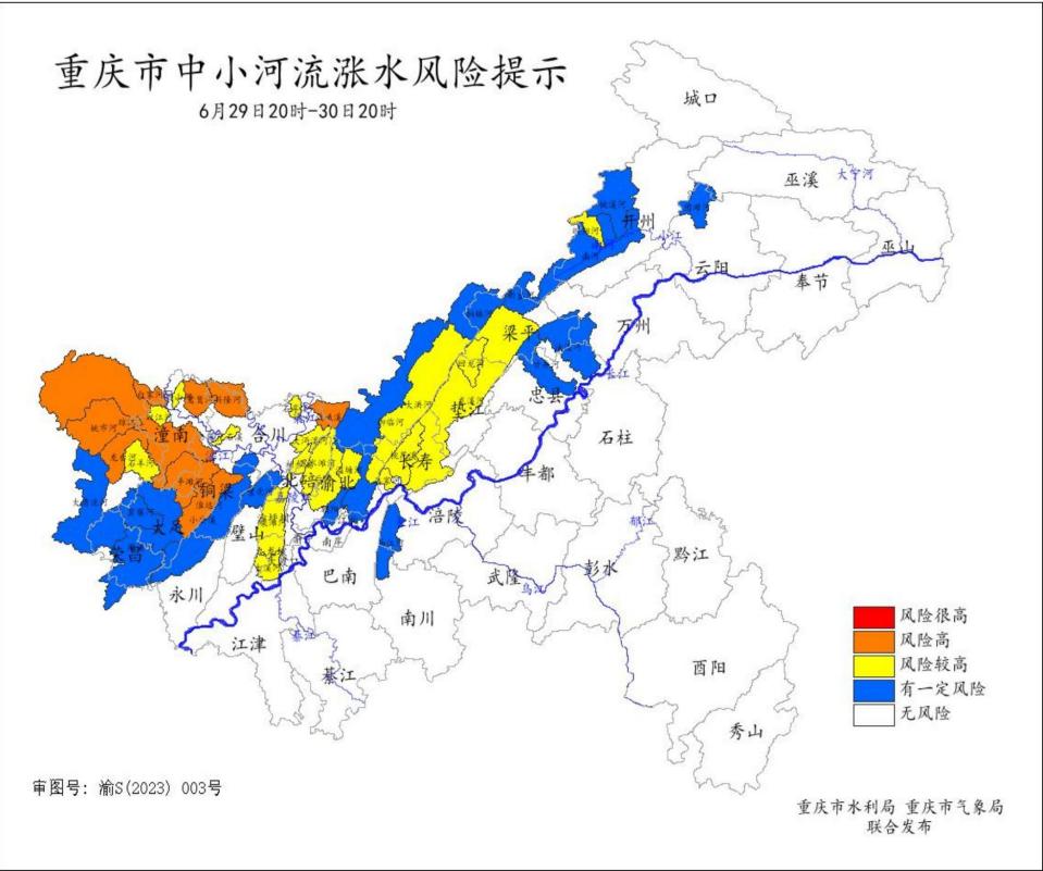 6月29日17时,重庆市水利局和重庆市气象局联合发布中小河流涨水风险提示:预计6月29日20时—6月30日20时,重庆25个区县部分中小河流有涨水风险。相关区县需加强值班值守,密切关注水雨情变化,做好防范工作。