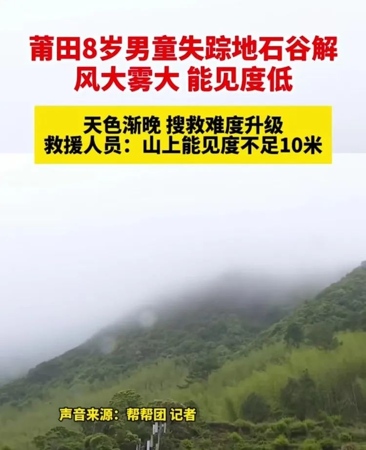据媒体报道,8岁男童邹某某于5月4日15时30分左右在仙游县石谷解下山途中与家人走失。男童身高112厘米,体型偏瘦,失踪点位于海拔约1500米处,具体处于第一个安全屋和第二个安全屋中间的一段碎石路上。