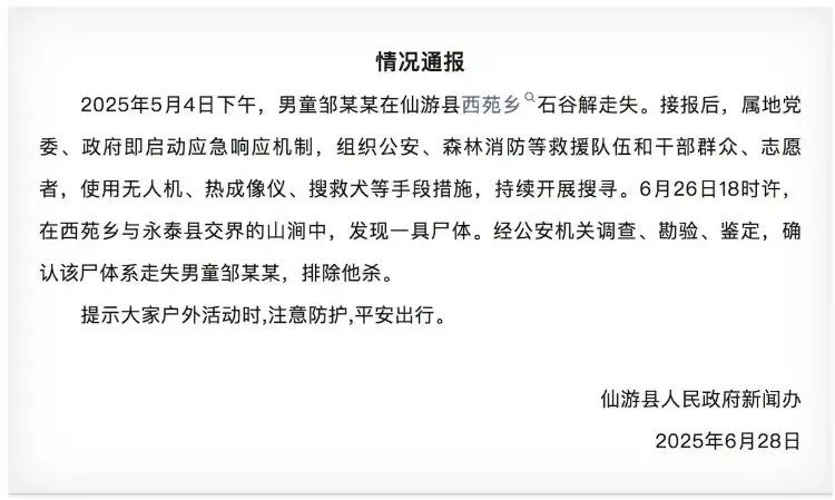 6月28日晚,福建省莆田市仙游县政府发布情况通报:在石谷解失踪50多天的8岁男童邹某某在当地一处山涧被找到,已无生命体征且排除他杀。