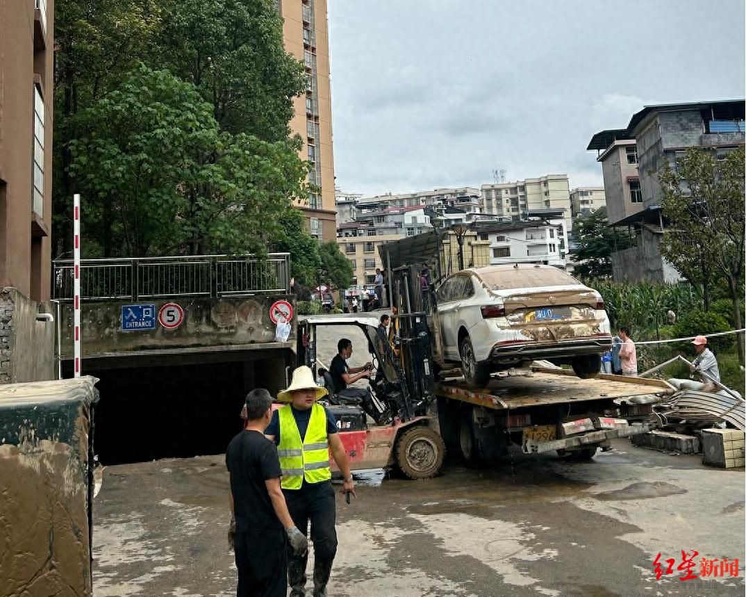洪水过后,二手车回收商家在龙领国际小区石道的石板上,贴上了“高价回收水淹车”的广告。6月21日起,地下车库被泡水的汽车一辆接着一辆被叉车拖出,再转运到小区外的停车场,等待定损。