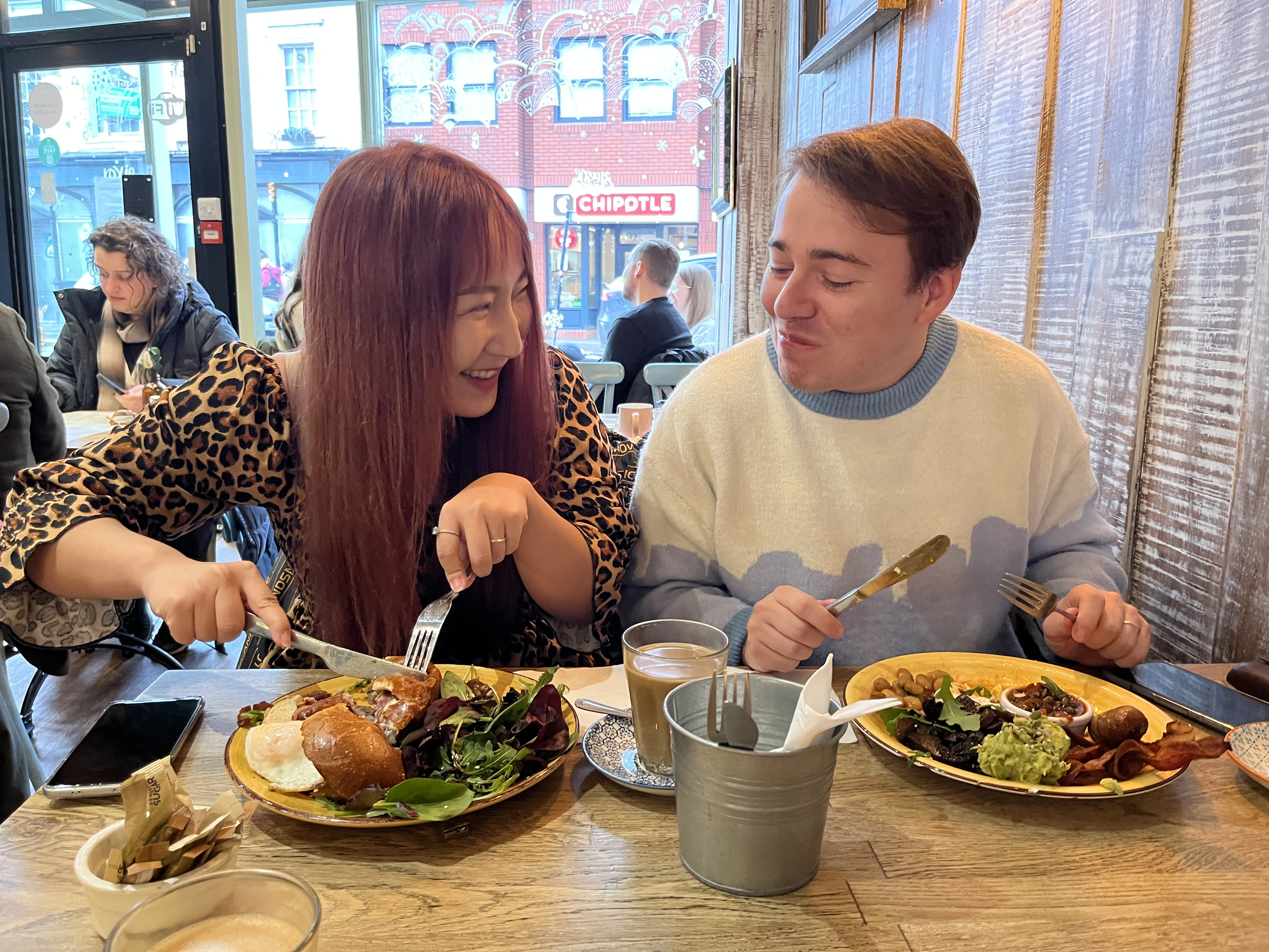 她来自哈尔滨,一头红色的长直发,穿着豹纹上衣。杰凯穿浅蓝和白的拼色毛衣,棕色短发,英国约克人。此刻,他温柔地看着恒艺用刀叉有些吃力地切着她面前的培根香肠鸡蛋汉堡。“恨不得用筷子吃!”她朝杰凯抱怨道。“这是美国的培根,英国的培根应该更大。”他指着盘子里的全英式早餐说。