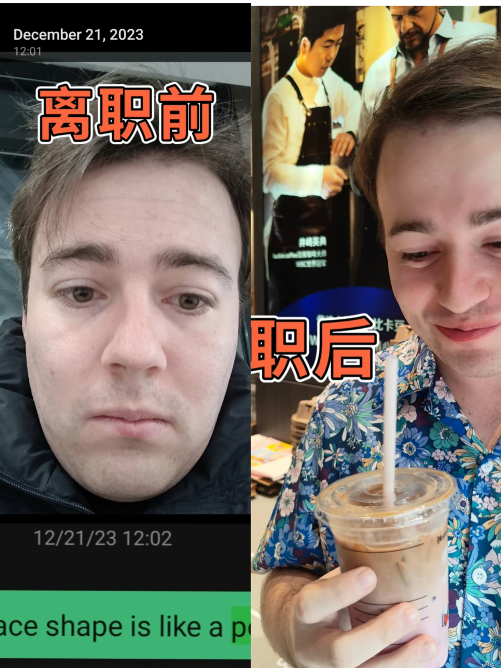 第二张,他坐在瑞幸店里喝咖啡,满脸满足,配字:“离职后。”