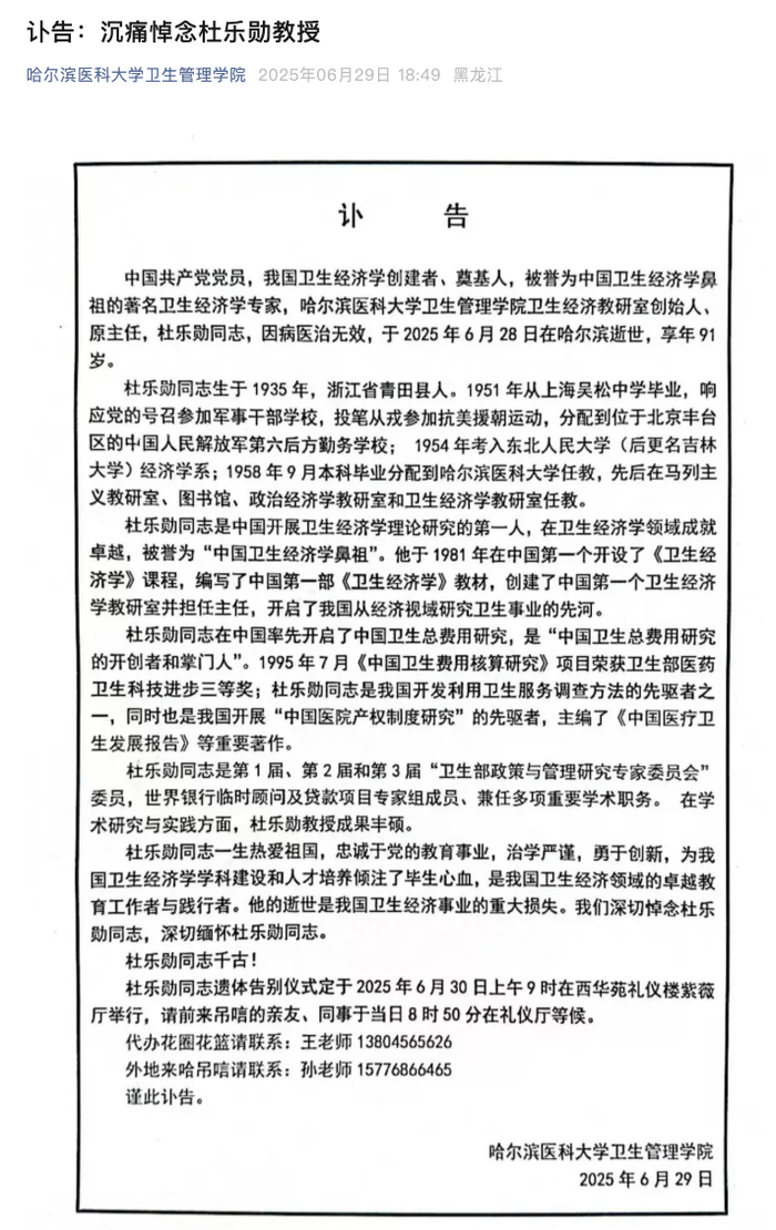 6月29日,哈尔滨医科大学卫生管理学院发布讣告:中国共产党党员,我国卫生经济学创建者、奠基人,被誉为中国卫生经济学鼻祖的著名卫生经济学专家,哈尔滨医科大学卫生管理学院卫生经济教研室创始人、原主任杜乐勋同志,因病医治无效,于2025年6月28日在哈尔滨逝世,享年91岁。