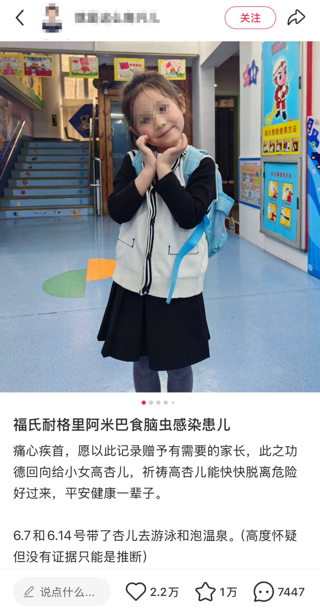 这则信息透露,其带5岁女儿于6月7日和6月14日游泳和泡温泉,6月22日出现头痛低热呕吐的情况,6月23日住进医院后出现抽搐,随后昏迷不醒,并转入重症监护室治疗,6月27日被检测出福氏耐格里阿米巴病原,情况非常危急。