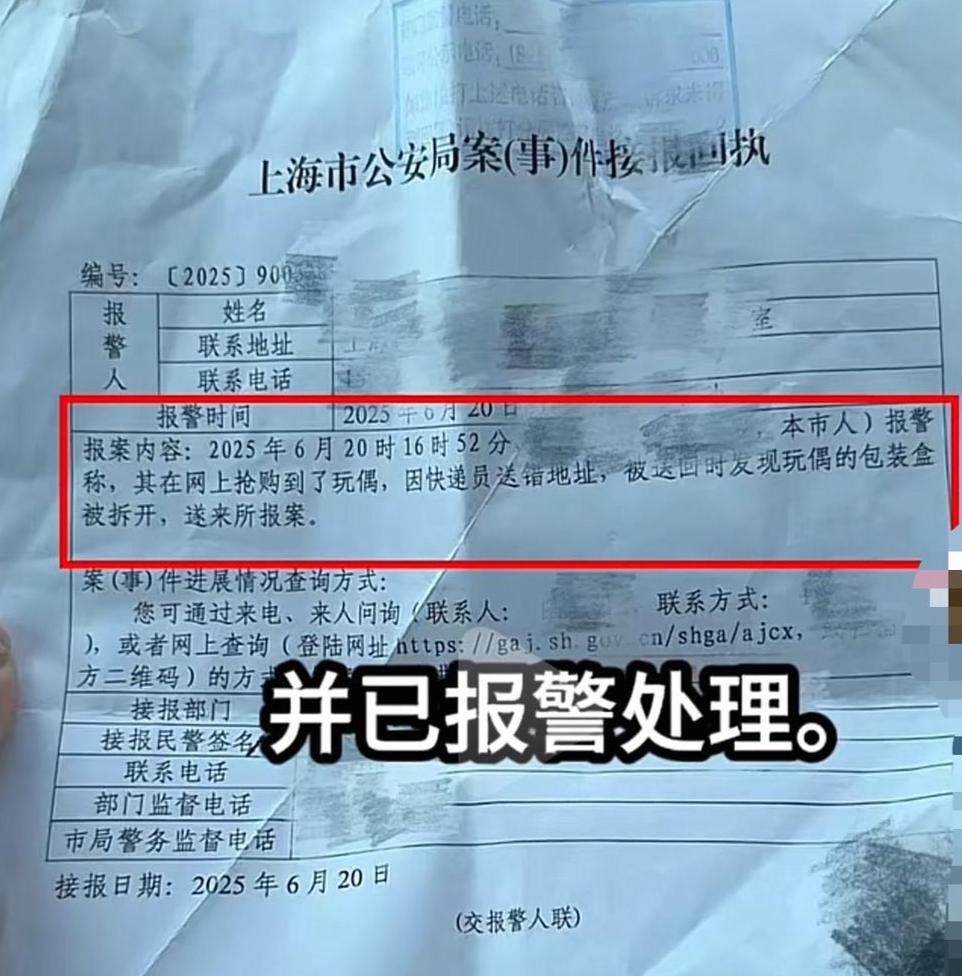 根据罗女士提供的上海市公安局案(事)件接报回执记录:6月20日16时52分许,罗女士报警称其在网上抢购玩偶,因快递员送错地址,被送回时发现玩偶包装盒被拆开。
