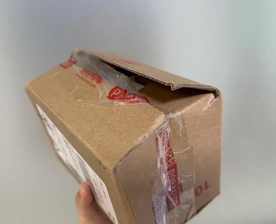 可在收货时小杨却发现,快递盒上方的透明胶带被半撕开,快递纸箱的一侧也被打开。小杨向红星新闻提供的当时拍下的图片显示,印有泡泡玛特商标的胶带已被损毁,快递盒一侧有明显被打开痕迹,快递盒内的拉布布盲盒外包装也出现一定程度破损。