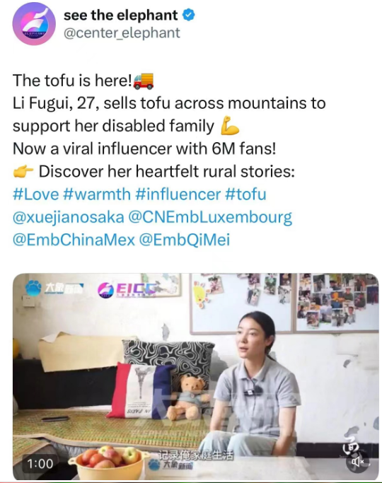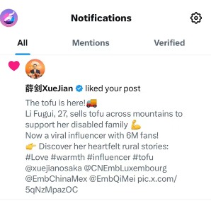 在海外社交平台X(社交平台名字,由推特等多家公司组成)上,中国驻大阪总领事薛剑点赞李福贵专访视频,以“豆腐姑娘”为题,对李福贵做了详细介绍并向全球观众进行了推介。