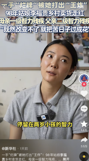 6月28日,新华社转发视频,“98年姑娘李福贵乡村卖货走红,母亲一级智力残疾、父亲二级智力残疾,‘既然改变不了 就把苦日子过成花’。”视频得到了40.6万网友的点赞。