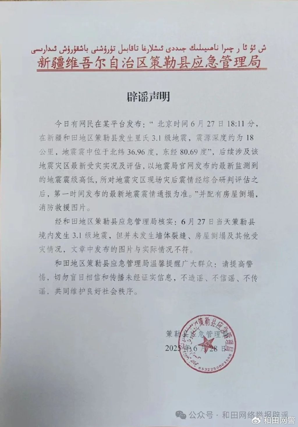 经策勒县应急管理局核实,6月27日当天策勒县境内发生3.1级地震,但并未发生房屋倒塌、应急救援及其他受灾情况,贴文中配发的图片系虚假不实图片。