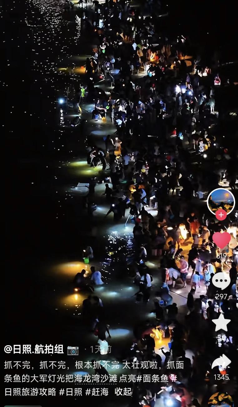 6月29日,山东日照有博主发布了一条“赶海大军凌晨点亮日照海龙湾沙滩”的航拍视频,颇为壮观。视频中,市民游客们头戴照明灯,提着水桶等赶海工具,到海滩边寻找一种名为“面条鱼”的鱼类,现场有人已收获了满满一桶的“面条鱼”。