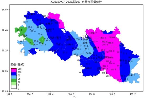 6月30日上午,红星新闻记者从自贡市气象台获悉,6月29日7时到6月30日7时,自贡出现了一次暴雨天气过程,全市共有大暴雨(100-249.9毫米)站点27个,特大暴雨(≥250毫米)站点4个,最大累计雨量出现在富顺县兜山,为286.2毫米。预计30日白天小雨转阴天间多云,晚上多云,气温 25℃~31℃。