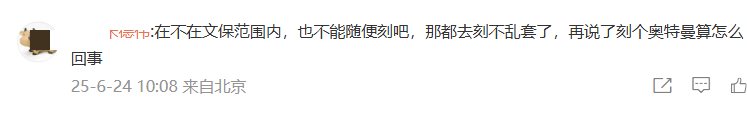 “奥特曼石窟”引发关注后有网友调侃,该创作弥补了摩崖石刻没有奥特曼的缺憾。但也有网友认为,在“中国石刻之乡”雕刻日本动漫形象是“文化入侵”,破坏了当地千年石刻文化的纯粹性。另外,在法律层面上,私人能否进行开凿雕刻石窟以及雕刻何种造型等也是热议焦点。