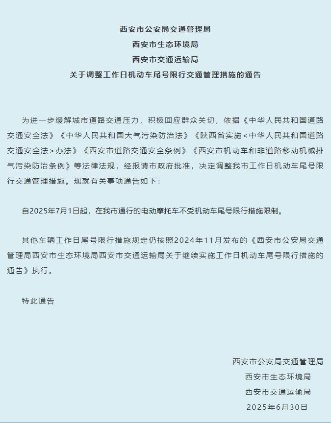6月30日,红星新闻记者从西安公安交管部门获悉,自2025年7月1日起,西安通行的电动摩托车不受机动车尾号限行措施限制。其他车辆工作日尾号限行措施规定仍按照2024年11月发布的《西安市公安局交通管理局西安市生态环境局西安市交通运输局关于继续实施工作日机动车尾号限行措施的通告》执行。