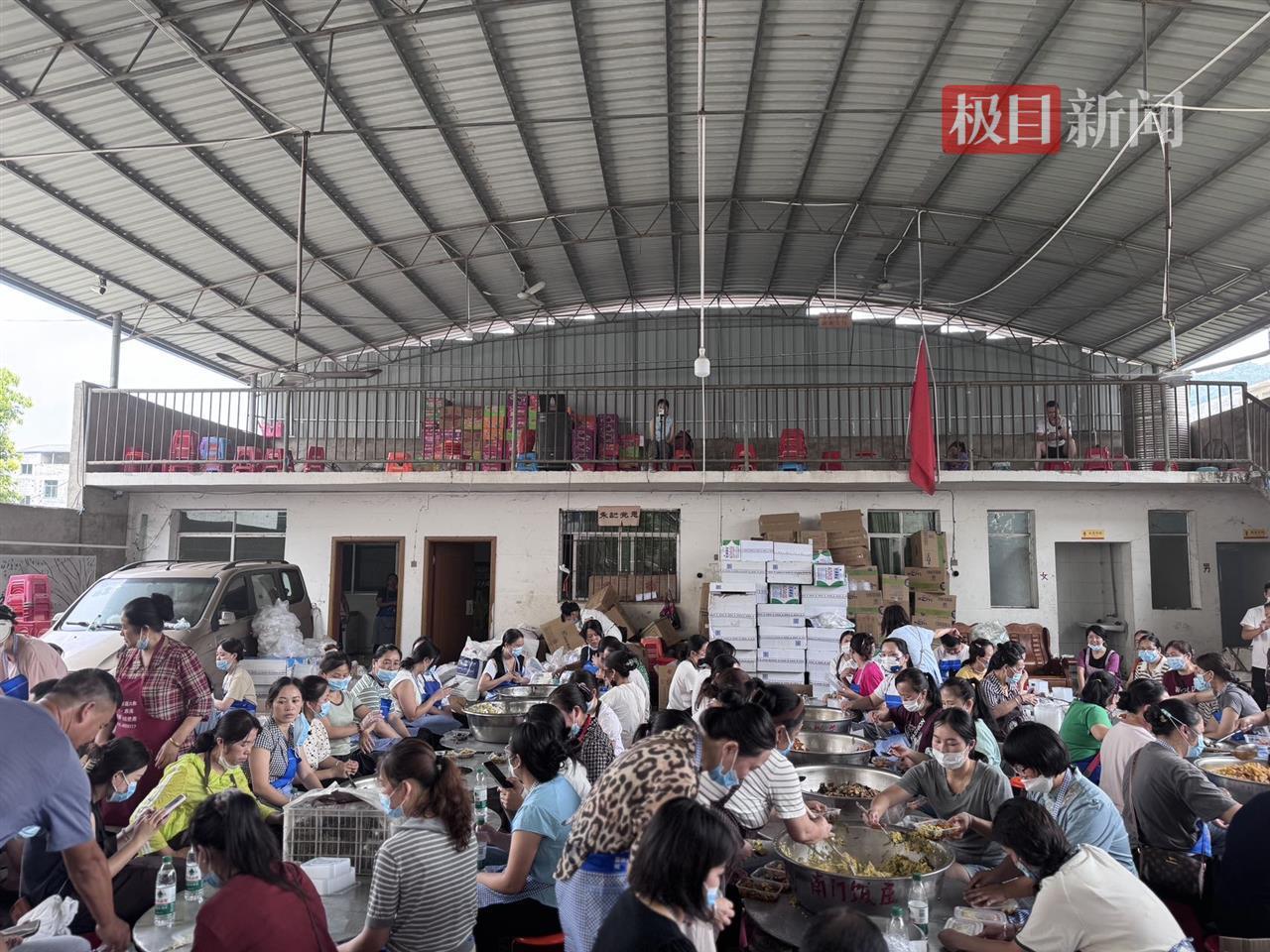 忠诚镇党委书记杨胜涛表示,当地各村基本都有做大锅饭的掌勺师傅,开始做后勤保障工作后,这些掌勺师傅就一直在此服务,近两天人手充足一点才开始轮班掌勺。6月29日多个后勤点合计制作了约1.8万份盒饭。