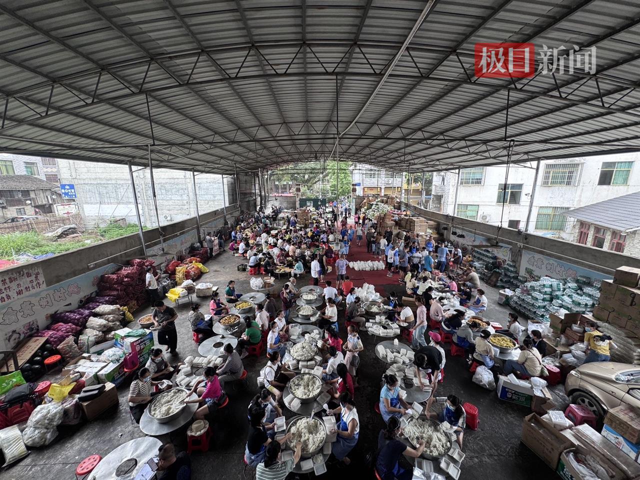 在忠诚镇忠诚村合约食堂热闹非凡,周边的村民自发赶到这里,洗菜、切菜、炒菜……原本是村民们用来办酒席的场地,成了榕江县城灾后的后勤保障点之一。