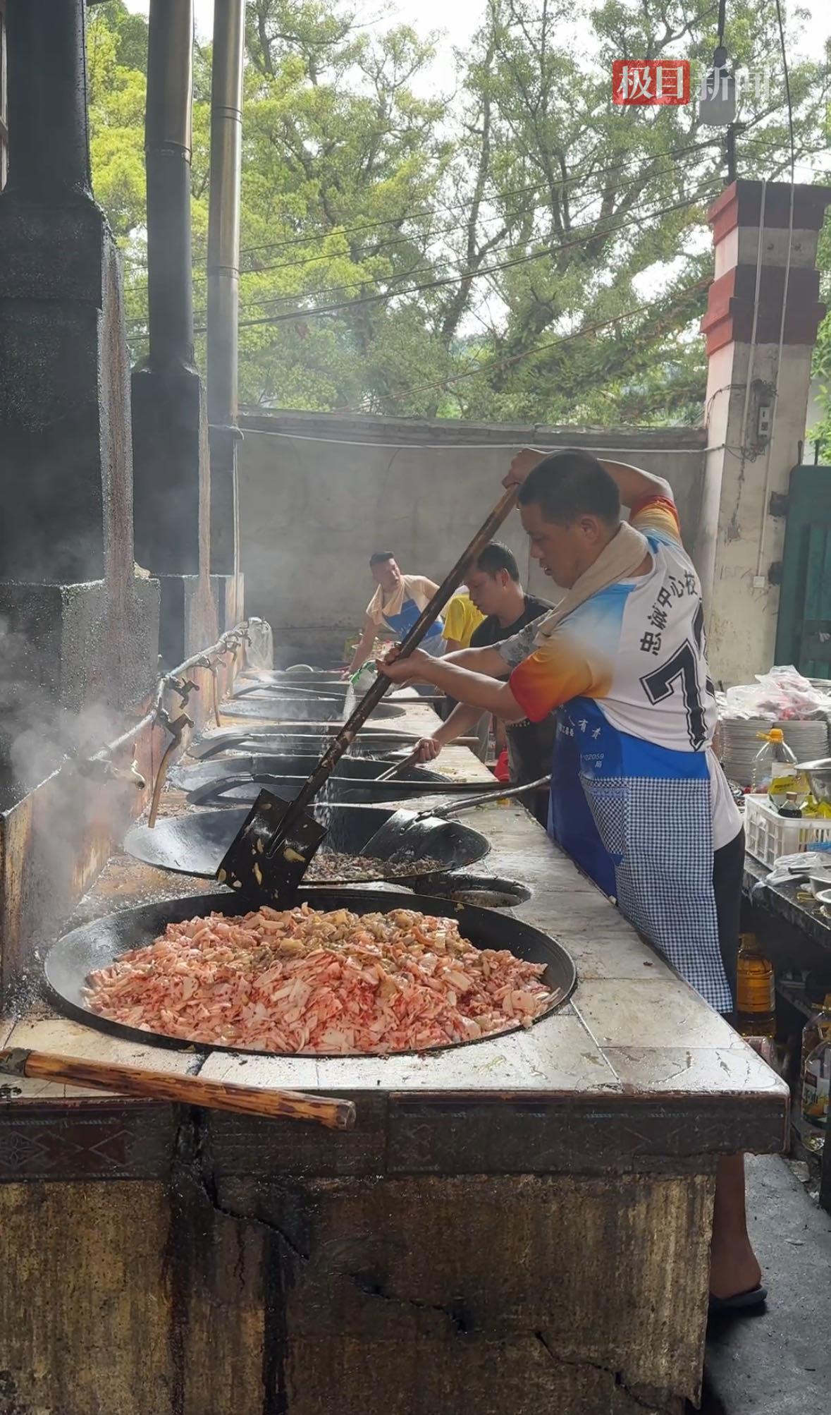 这个后勤保障点摆着七口大锅,每口大锅由当地的大师傅掌勺,他们在灶台前挥舞着铲子,将一锅一锅的热菜炒出,又装盒送到清淤清障前线。高温天气与柴火的炙烤下,掌勺大师傅们满头大汗,用脖子上挂着的毛巾擦了擦,又继续挥舞着手里的锅铲。