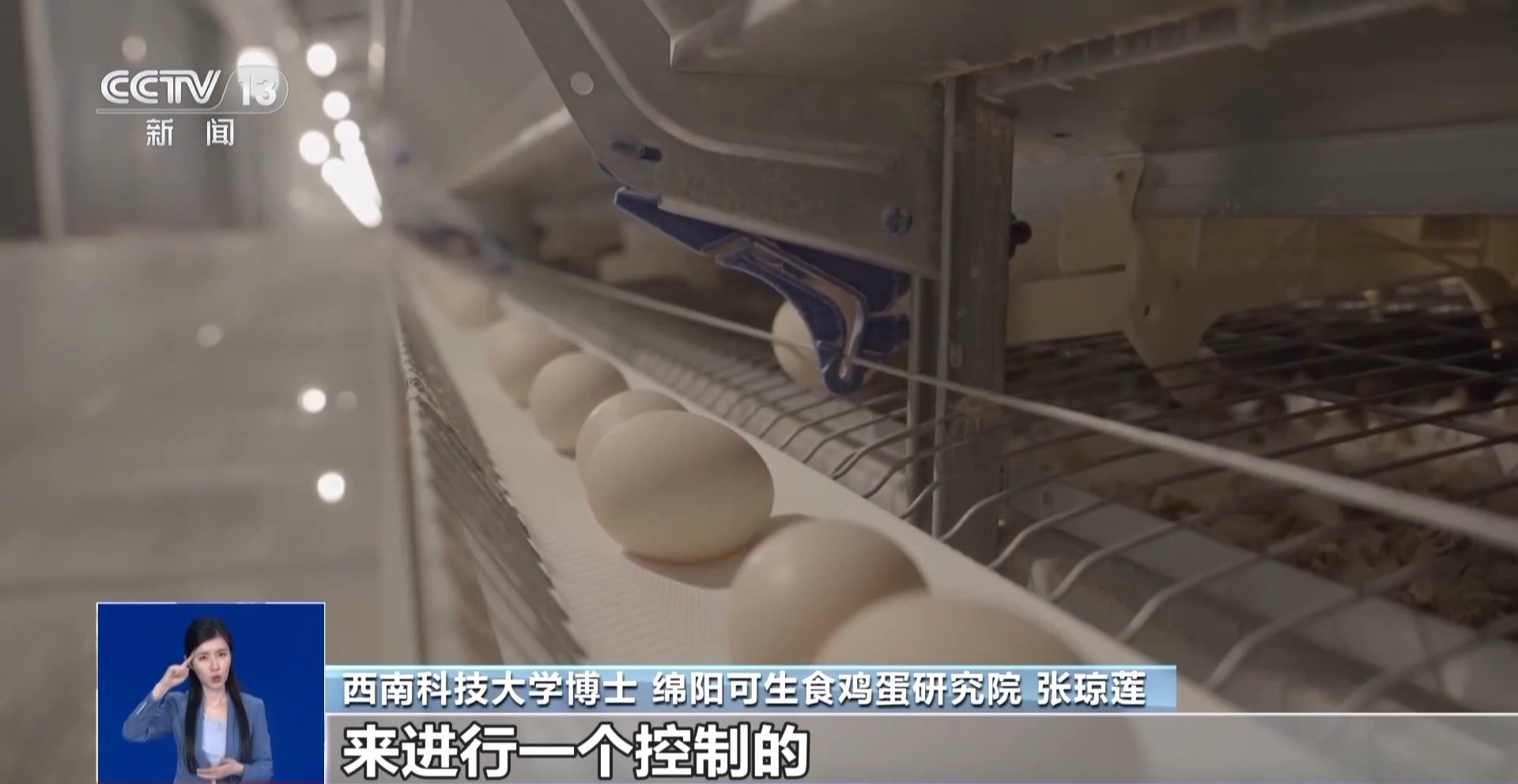 西南科技大学博士绵阳可生食鸡蛋研究院张琼莲:它生活的环境温度、空气质量,包括每天的采食和饮水,都是通过智能化的设备进行控制的,避免外源带入有害的微生物,包括沙门氏菌等。