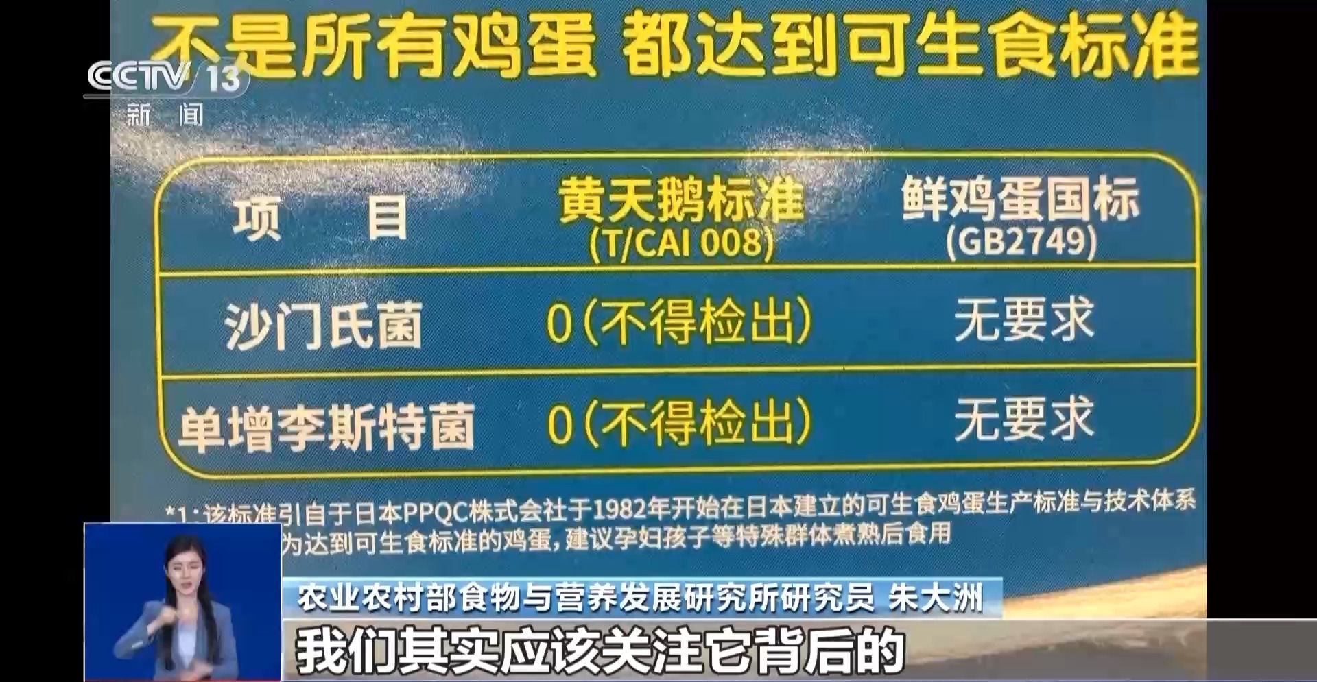 农业农村部食物与营养发展研究所研究员朱大洲:购买可生食鸡蛋,其实应该关注它背后的产品标签,看它执行的是哪个标准。我们可以购买品牌影响力比较大、信任度高的一些企业的产品。