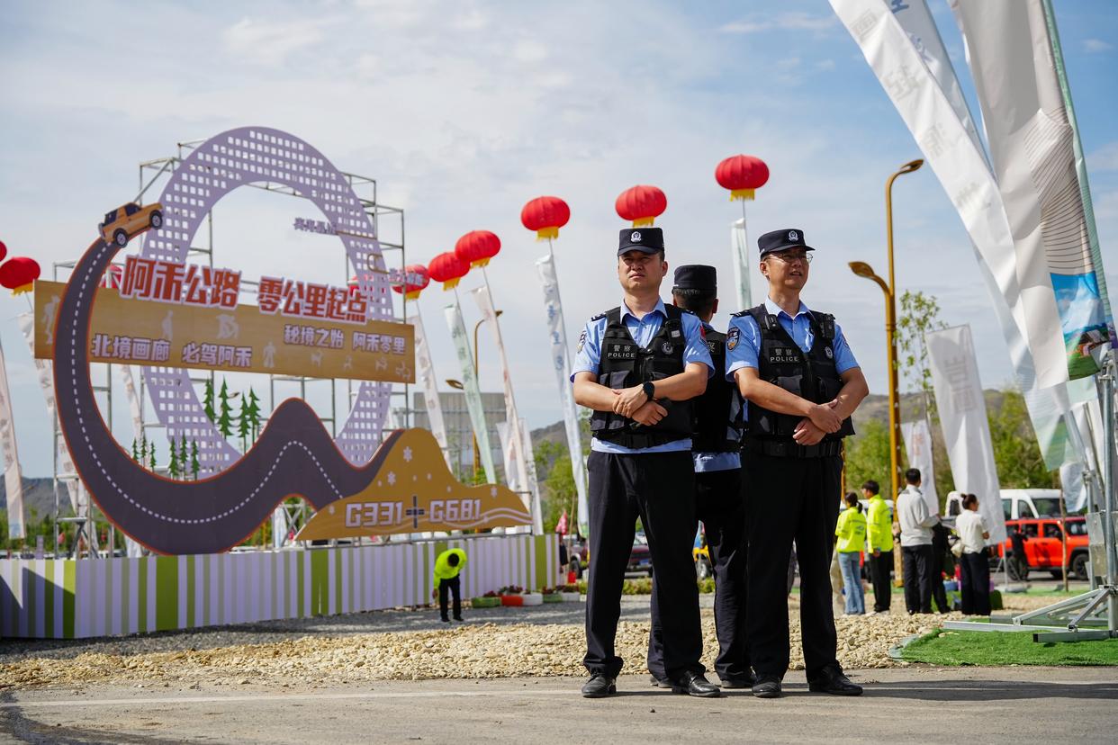 6月30日,在阿禾公路通车仪式现场,阿勒泰边境管理支队民警在执勤。新华社记者 徐宏岩 摄