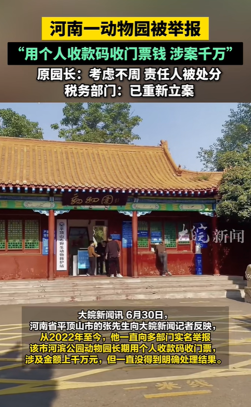 6月30日,河南省平顶山市的张先生向大皖新闻记者反映,从2022年至今,他一直向多部门实名举报该市河滨公园动物园长期用个人收款码收门票,涉及金额上千万元,但一直没得到明确处理结果。