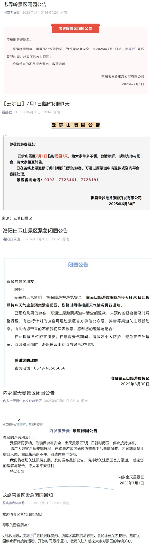 一场自6月30日夜间起席卷河南多地的强降雨,迫使省内多家知名景区在7月1日紧急闭园。由于部分山区降雨量极大,山洪风险骤增,为确保游客人身安全,洛阳白云山、南阳老界岭等热门景点迅速启动应急预案,暂停接待游客。
