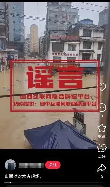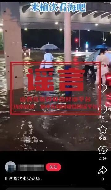 6月30日,有网民在某网络平台发布视频称“山西榆次遭遇水灾”。据榆次区委网信办核实,属地未出现汛情,该视频是将近日发生在外地的水灾视频张冠李戴,署名山西榆次发布,为不实信息。
