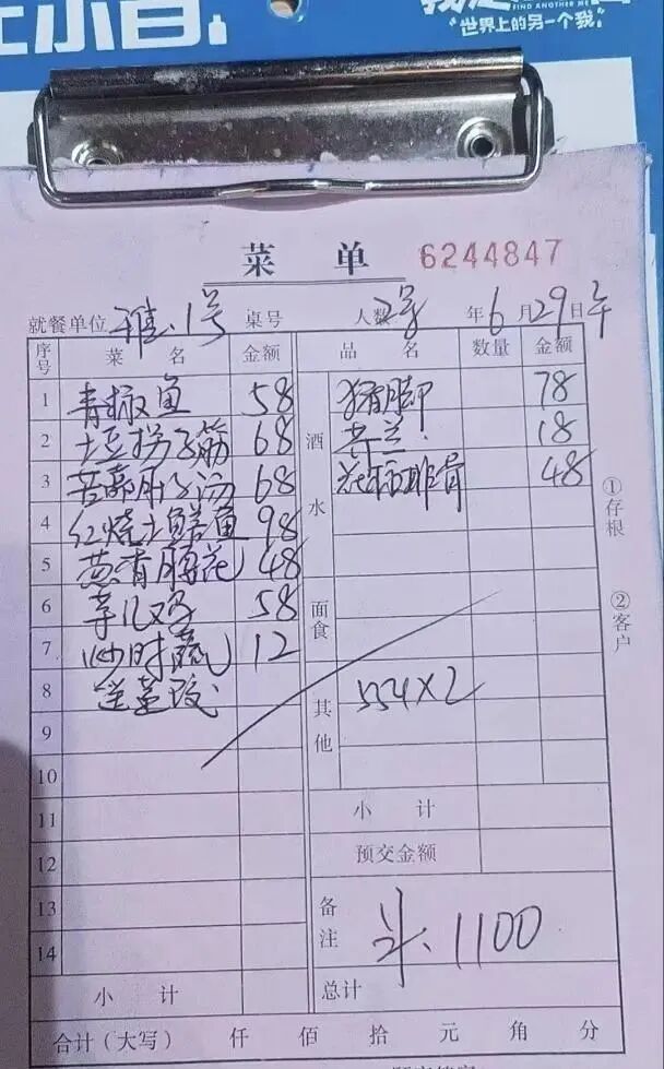 高洪波还晒出了账单。高洪波亮出自己的手机二维码预付2000元,最终实际消费1108元,老板抹了8元的零头,高洪波实付1100元。