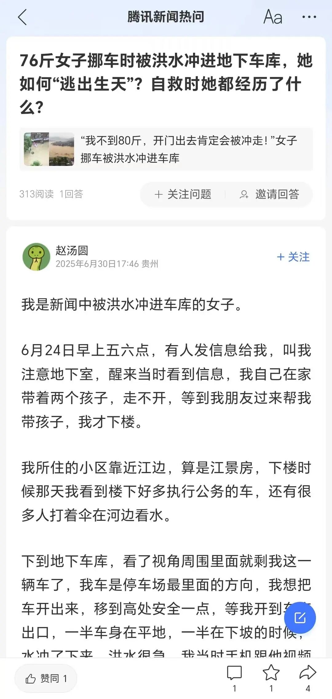 6月30日,当事人赵女士在网上发声,讲述了她遭遇洪水的种种细节。同日,她在接受红星新闻记者采访时表示,自己在榕江县生活这么多年,从未见过如此严重的洪水,也未曾预料到洪水会如此凶猛,要不然也不会贸然前往地下车库挪车。