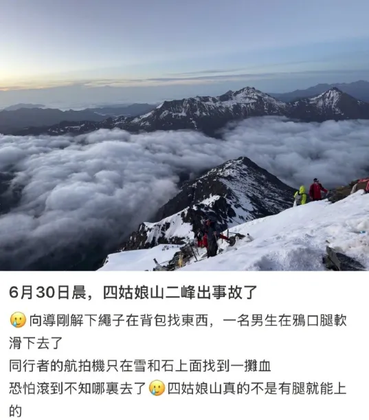 大皖新闻记者在某社交平台上看到网民发帖,6月30日凌晨,四川阿坝四姑娘山二峰发生一起事故,“向导解下绳子找背包里的东西时,一名男生在垭口腿软,滑下了山。”而在评论区中,还有目击者在评论区配图称,“登山杖都还在雪里插着,眼睁睁看着(男生)滑下去的。”