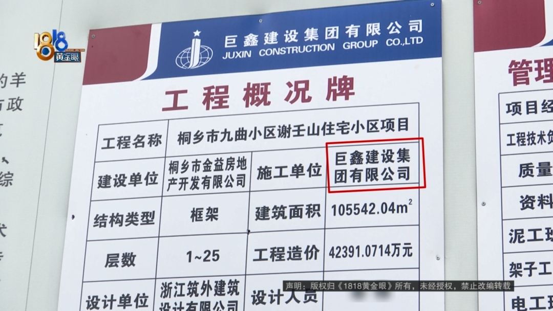 边上的工程是嘉兴桐乡九曲小区谢壬山住宅小区项目,施工单位是巨鑫建设集团有限公司。