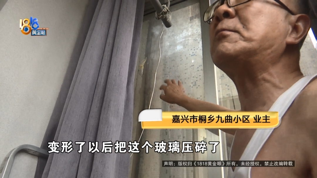 嘉兴市桐乡九曲小区 业主B:变形了以后把这个玻璃压碎了,就挖土打桩的时候,你看动都动不了这个窗。