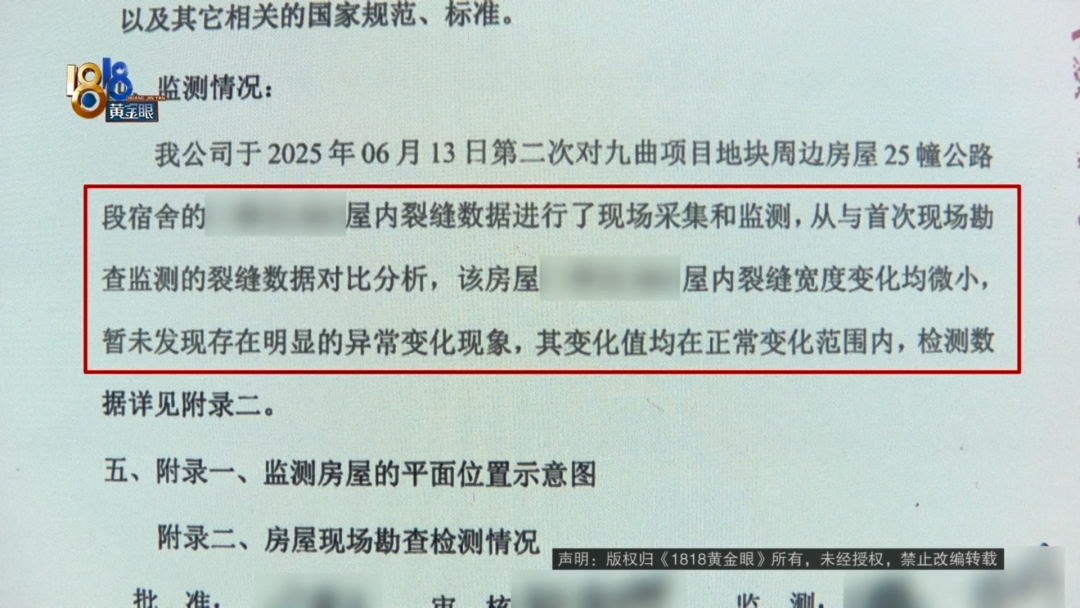今年6月14号,公司又对某户业主家里的裂缝数据进行了现场采集和监测,结论是“屋内裂缝宽度变化均微小,暂未发现存在明显的异常变化现象,其变化值均在正常变化范围内”。