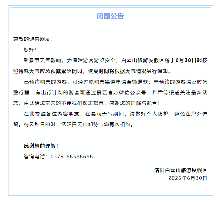 7月1日早晨,河南洛阳嵩县白云山景区发布公告,宣布紧急闭园。