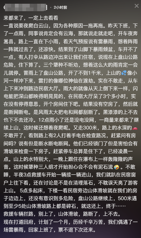 多位网友在社交平台发文,讲述了自己在景区遭遇暴雨的经过。