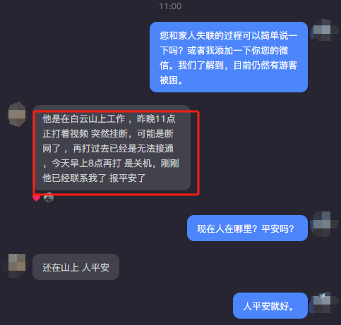 一名亲人在白云山上工作的网友告诉记者,在6月30日深夜11点多钟,与家人视频通话时,突然网络中断。7月1日早上八点,电话未接听,直到中午11点左右,才与家人取得联系,报了平安。