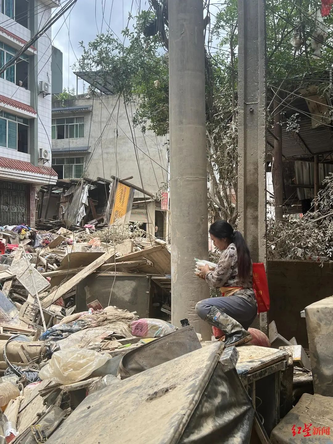 领物资的路很难走,要穿过半条被垃圾和淤泥堆满的场坝西路,踩着被清理出来沾满黄泥的沙发、门框和柜子,还要时刻小心脚下的泥坑和钉子。