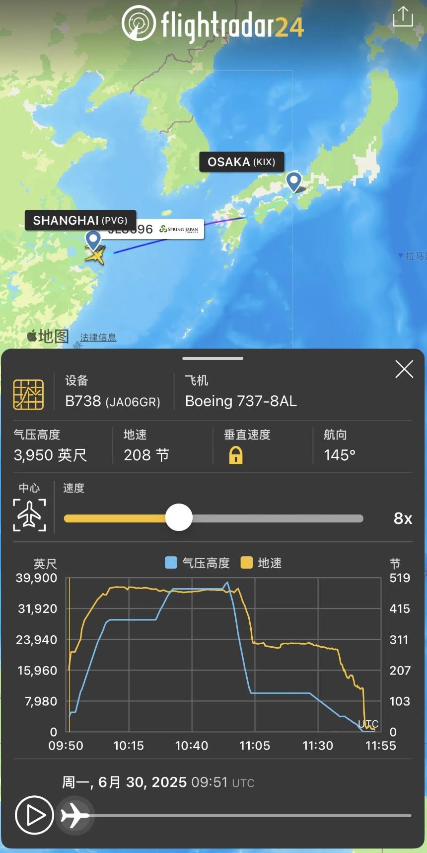6月30日,日本春秋航空JL8696/IJ004航班,原定于当天17时35分从上海浦东国际机场起飞,并计划于当日21时35分抵达日本东京,但该航班在起飞1个小时左右后发生故障。