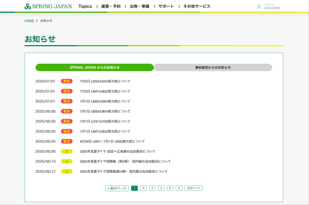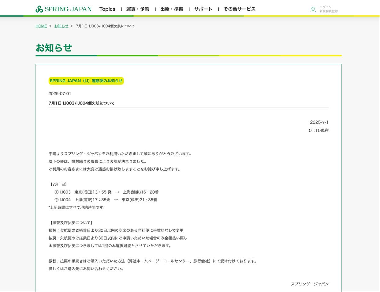 7月1日,记者在日本春秋航空官网上看到,这两日挂出多个紧急情况公告,多个航班取消。取消原因显示为“由于飞机调度原因”。